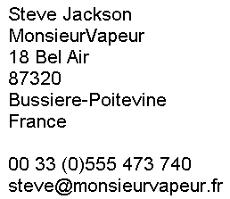 de la piste. Je commande environ tous les quinze jours. Si les articles sont en stock à l'entrepôt, il faudra probablement une semaine pour me parvenir et une autre semaine par la poste avant la livraison. Il faut donc comprendre qu'il peut y avoir un délai de quatre semaines avant la livraison. Dans certains cas, cela pourrait être plus rapide, mais vous ne devriez pas compter sur cela. Si ce délai n'est pas acceptable, veuillez ne pas passer de commande. Je négocie sous le régime des micro-entrepreneurs, je paie léquivalent de la taxe de vente TVA / TVA à lavance lorsque jachète des biens et je ne peux pas l'exempter pour les acheteurs qui pourraient être TVA / TVA enregistré. En raison de mon emplacement à la campagne dans le Massif central français, je ne m'attends pas à un commerce de passage, mais cela ne veut pas dire que je n'aime pas rencontrer d'autres passionnés de modélisation et de chemins de fer, ni un potentiel les clients. Si vous souhaitez vous rencontrer, ne partez pas dans lespoir, contactez-moi pour prendre rendez-vous d'abord. Le français nest pas mon langage naturel et, pour la gamme limitée de mots que je comprends, ma vitesse de traduction est lente. Si vous parlez anglais, je serai en mesure de répondre à vos questions plus rapidement. Si vous voulez me contacter s'il vous plaît utilisez email. Si vous parlez français (ou une autre langue), utilisez un outil de traduction (tel que deepl.com) ou du moins, comprenez que je vais essayer d'utiliser un tel système pour votre texte. Veuillez éviter les abréviations, les argot ou les expressions qui risquent de vous paraître faussés. pour fournir des problèmes pour une traduction sur silicium. Si vous parlez anglais, je serai en mesure de répondre à vos questions plus rapidement. Si vous voulez me contacter s'il vous plaît utilisez email. Si vous parlez français (ou une autre langue), utilisez un outil de traduction (tel que Google translate) ou du moins, comprenez que je vais essayer d'utiliser un tel système pour votre texte. Veuillez éviter les abréviations, les argot ou les expressions qui risquent de vous paraître faussés. pour fournir des problèmes pour une traduction sur silicium. Je suis heureux de poster en France métropolitaine et dans la rubrique "Western". Pays de la CE (Royaume-Uni, Allemagne, Pays-Bas, Belgique, Danemark, Suède, Norvège, Autriche, Espagne, Portugal, Italie, Luxembourg, Monaco, République d'Irlande) et les îles Anglo-Normandes. Lorsque vous utilisez le site, choisissez entre les options & quot; France & quot; ou & quot; autre pays & quot; option dexpédition (si vous faites une erreur, vous pouvez alors remettre à zéro le panier et recommencer). Cela ne veut pas dire que je ne pourrais pas envisager denvoyer dans dautres pays tels que lAustralie, la Nouvelle-Zélande, Singapour ou le Japon, qui avoir un système de livraison fiable et si vous vivez dans l'un de ceux-ci et souhaitez acheter quelque chose, contactez-moi s'il vous plaît et je verrai ce qui peut être arrangé pour l'expédition. Un autre commentaire sur les frais daffranchissement: jai dabord à deviner le coût probable de laffichage darticles uniques. Je conviens que lajout dun article en double ne devrait pas doubler le coût, mais jai à faire un choix parmi les options du panier Paypal et je suis par défaut à la méthode où il nexiste pas de remise daffranchissement pour plusieurs articles (qui fonctionnaient pendant mes précédentes boutiques en ligne où lachat de plusieurs articles nétait pas si courant). Si vous achetez de nombreux articles compacts et légers, je peux soit vous proposer de rembourser les frais de port en trop, soit, si vous préférez payer le montant correct en premier lieu, envoyez-moi un email avec vos articles et je pourrai ensuite faire une facture spécifique. pour cet ensemble.Bien que, en tant que revendeur, jaie un accès complet à la banque dimages Hornby Hobbies, jai été surpris de constater que de nombreux articles du catalogue Airfix nont pas dimage individuelle à télécharger, bien que les images peuvent bien exister dans leurs catalogues imprimés et en ligne ou téléchargeables. Si les pages Web de ce site ne présentent pas les images d'un élément qui vous intéresse et que vous souhaitez afficher une image, puis-je vous suggérer de rechercher dans les catalogues ou de voir ce que votre moteur de recherche Internet préféré affiche? Hornby ne semble pas avoir produit de vidéos Airfix spécifiques, mais il existe plusieurs "techniques". vidéos dans la section Humbrol. Vous devez également comprendre que certains des articles les plus anciens des catalogues seront hors de production, tandis que les plus récents risquent de ne pas avoir encore été produits. Mes pages de lignes de produits individuelles sont conçues pour afficher les articles actuellement disponibles dans le magasin ou destinés à la production et à la pré-commande. Veuillez comprendre que jutilise les dates de production prévues fournies par lusine ou limportateur et que celles-ci peuvent être soumises à des retards.